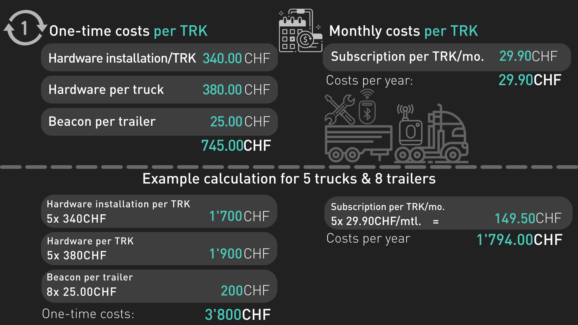 Monthly costs – These apply per truck and cover ongoing operation and service.