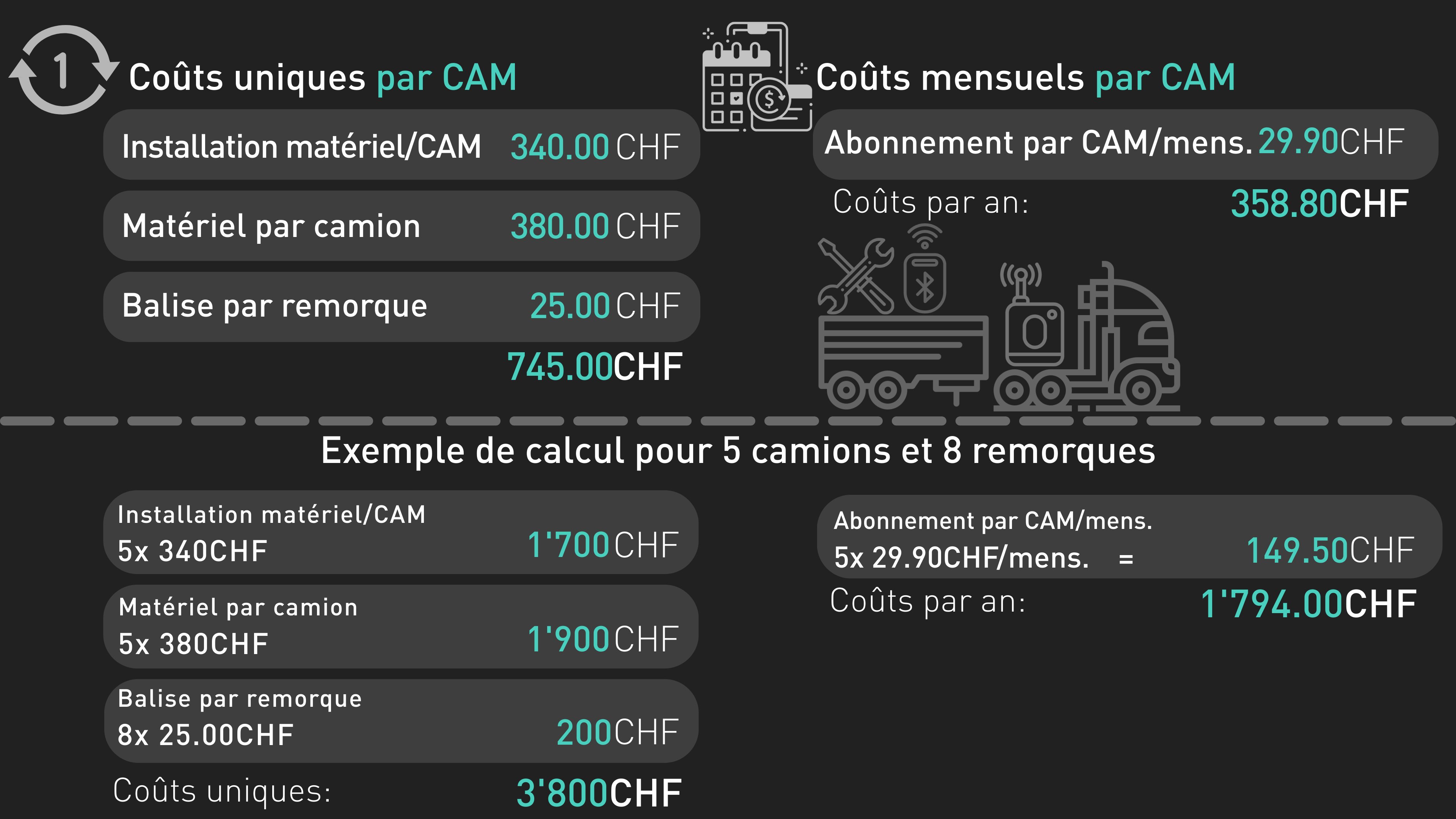 Coûts mensuels – Ceux-ci s'appliquent par camion et couvrent le fonctionnement continu et le service.